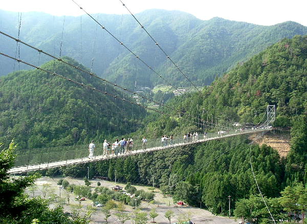 国道168号の上野地(うえのじ)と対岸の谷瀬を結ぶ。 高さ54m、長さ297m。日本最長の鉄線の吊橋。昭和29年谷瀬の村落の人々が一世帯あたり20万円という当時としては大金を出し合い架けたのがこの吊橋である。それまでの川に架けた木製の橋とは違い、台風がきても流されることはなく谷瀬の人々にとって生活のかかった橋である。