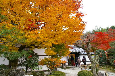 「竹ノ内門跡」とも呼ばれる格式ある門跡寺院。毎年11月半ばには、モミジで赤一色に染まり、深山と海洋を表現した小堀遠州による枯山水庭園は国の名勝。さらに、虎を描いた狩野永徳のふすま絵など見どころ満載。昼と夜の寒暖差が激しく色づきが鮮やかなのが、曼殊院の紅葉の特徴。